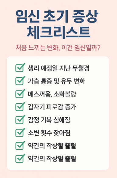 임신을 준비하거나 계획하지 않은 상태에서도 갑작스러운 신체 변화는 여성의 촉각을 곤두세우게 만듭니다. 특히 임신 초기에는 확실한 징후가 아닌, 애매하고 생리 전 증상과 비슷한 증상들이 나타나기 때문에 헷갈리는 경우가 많아요. 이번 글에서는 "혹시 나 임신한 걸까?"라는 생각이 들었을 때 참고하면 좋은 임신 초기 증상 체크리스트를 정리해드립니다. 이 글을 통해 본인의 상태를 점검해보고, 필요 시 병원 진료나 테스트를 고려해보는 것이 좋습니다.